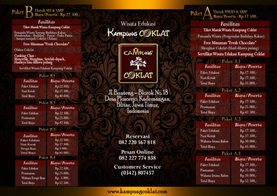 Selain tiket reguler, disini kamu juga bisa membeli tiket tambahan. Kampung coklat merupakan salah satu destinasi favorit wisatawan yang datang ke blitar selain makam bung karno. Kampung coklat terletak di jalan benteng blorok nomor 18 desa plosorejo kademangan, kabupaten blitar.